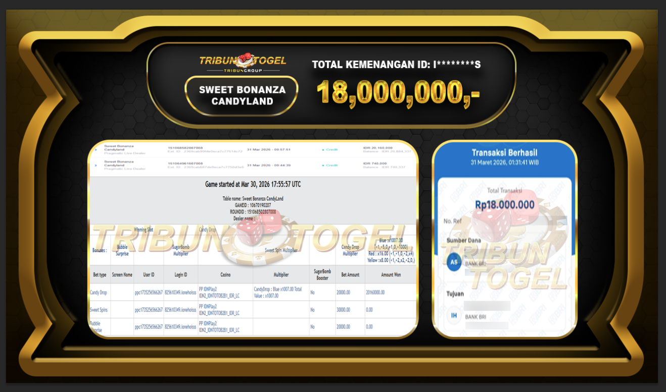 Kami ucapkan selamat kepada user ID : I********S  telah berhasil withdraw sebesar Rp.18,000,000: SLOT SWEET BONANZA CANDYLAND  Bukti pembayaran jackpot member Tribuntogel kami bayar lunas dengan waktu paling singkat.