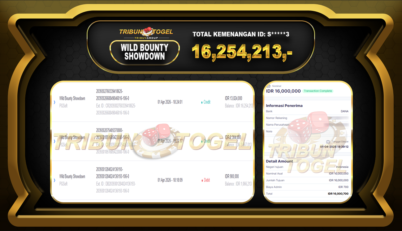 Kami ucapkan selamat kepada user ID : S*****3 telah berhasil withdraw sebesar Rp. 16,254,213, di game : SLOT WILD BOUNTY SHOWDOWN Bukti pembayaran jackpot member Tribuntogel kami bayar lunas dengan waktu paling singkat.