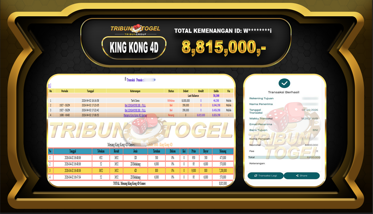 Kami ucapkan selamat kepada user ID : W******i telah berhasil withdraw sebesar Rp.8,815,000,- di game : KING KONG 4D Bukti pembayaran jackpot member Tribuntogel kami bayar lunas dengan waktu paling singkat.