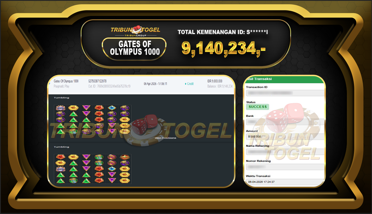 Kami ucapkan selamat kepada user ID : S******l telah berhasil withdraw sebesar Rp.9,140,234,- di game : GATES OF OLYMPUS 1000 Bukti pembayaran jackpot member Tribuntogel kami bayar lunas dengan waktu paling singkat.