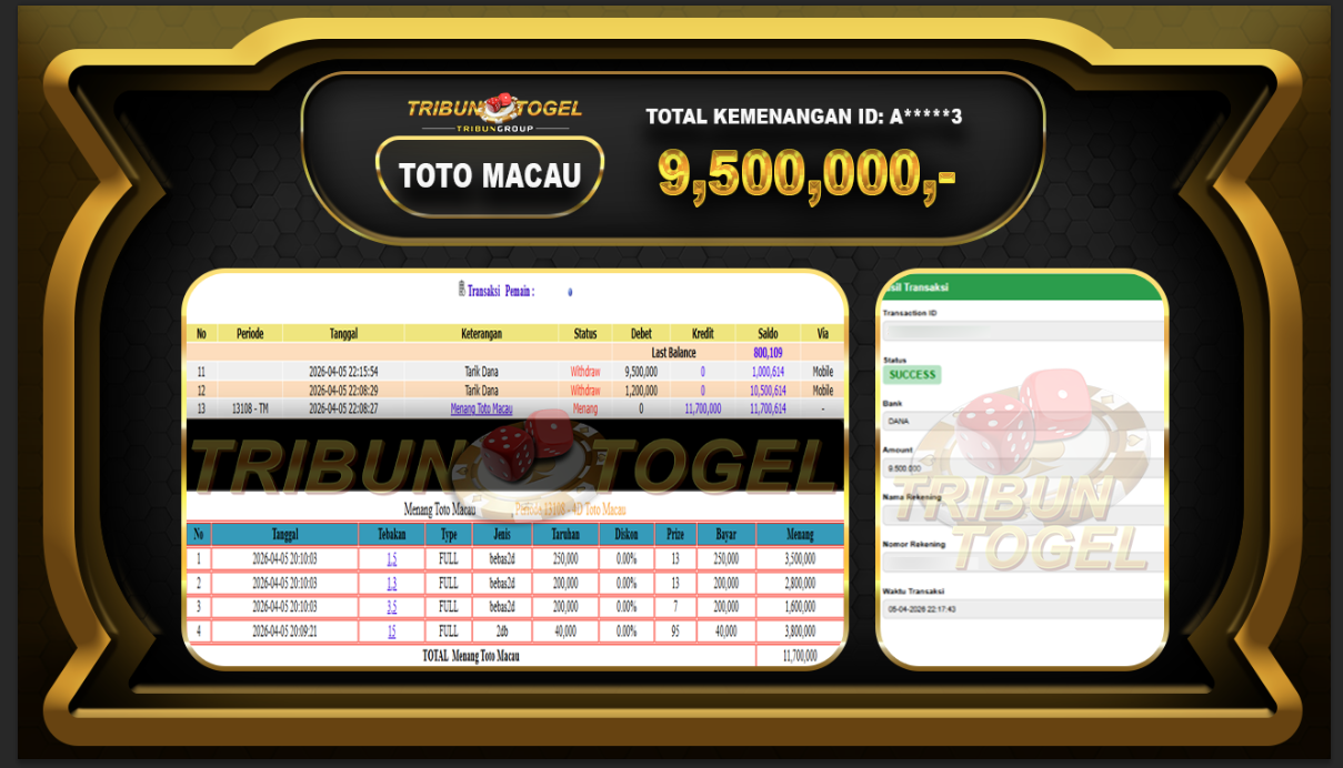 Kami ucapkan selamat kepada user ID : A*****3 telah berhasil withdraw sebesar Rp.9,500,000,- di game : TOTO MACAU Bukti pembayaran jackpot member Tribuntogel kami bayar lunas dengan waktu paling singkat