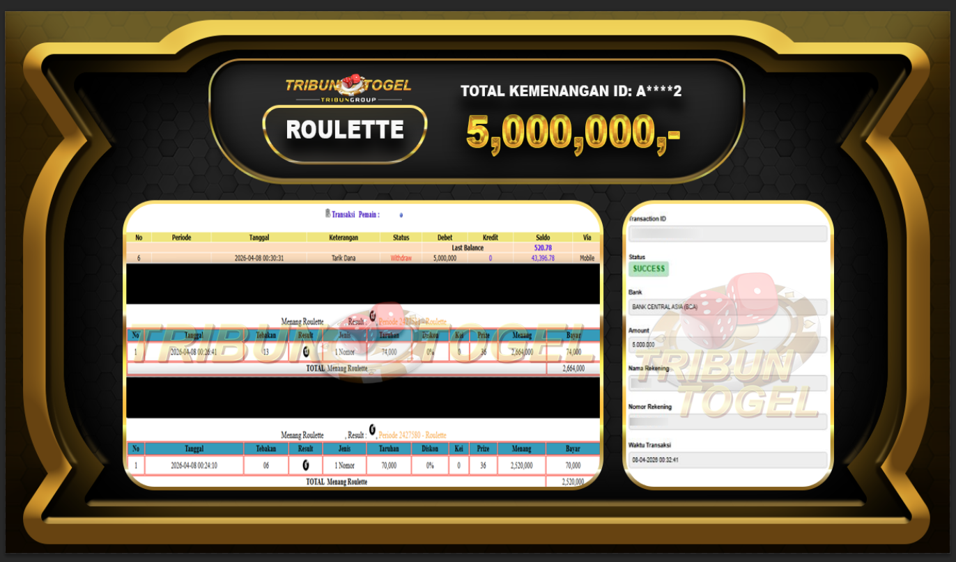 Kami ucapkan selamat kepada user ID :A****2 telah berhasil withdraw sebesar Rp.5,000,000,- di game : ROULETTE Bukti pembayaran jackpot member Tribuntogel kami bayar lunas dengan waktu paling singkat.