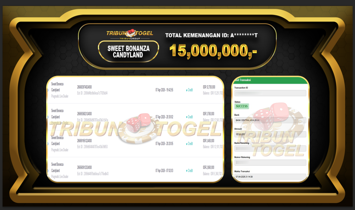 Kami ucapkan selamat kepada user ID : A********T telah berhasil withdraw sebesar Rp.15,000,000,-: SLOT SWEET BONANZA CANDYLAND Bukti pembayaran jackpot member Tribuntogel kami bayar lunas dengan waktu paling singkat.