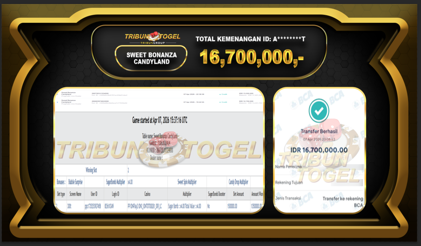 Kami ucapkan selamat kepada user ID : A********T telah berhasil withdraw sebesar Rp.16,700,000,-: SLOT SWEET BONANZA CANDYLAND Bukti pembayaran jackpot member Tribuntogel kami bayar lunas dengan waktu paling singkat.