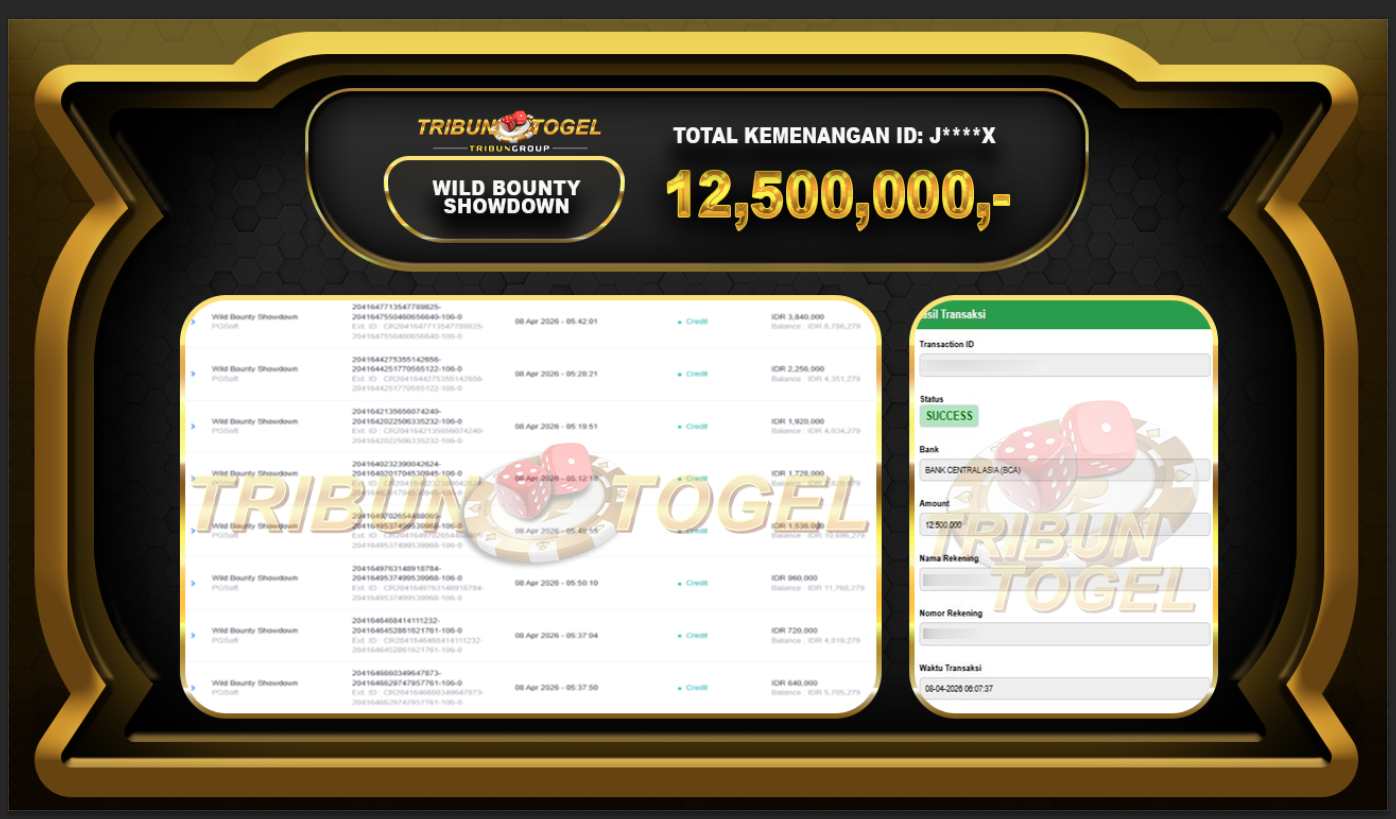 Kami ucapkan selamat kepada user ID : J****X telah berhasil withdraw sebesar Rp. 12,500,000,- di game : SLOT WILD BOUNTY SHOWDOWN Bukti pembayaran jackpot member Tribuntogel kami bayar lunas dengan waktu paling singkat.