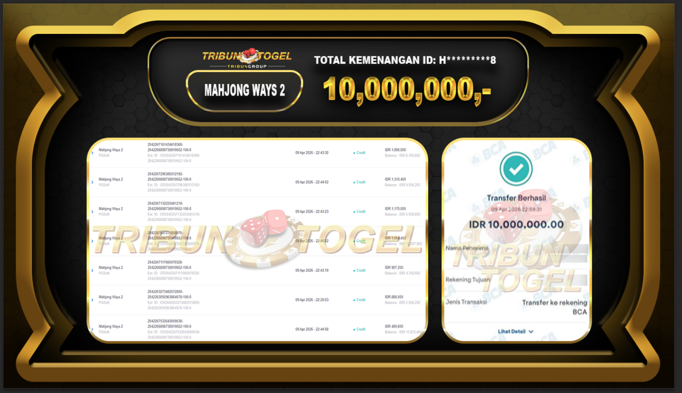 Kami ucapkan selamat kepada user ID : H*********8 telah berhasil withdraw sebesar Rp.10,000,000,- di game : SLOT MAHJONG WAYS 2 Bukti pembayaran jackpot member Tribuntogel kami bayar lunas dengan waktu paling singkat.