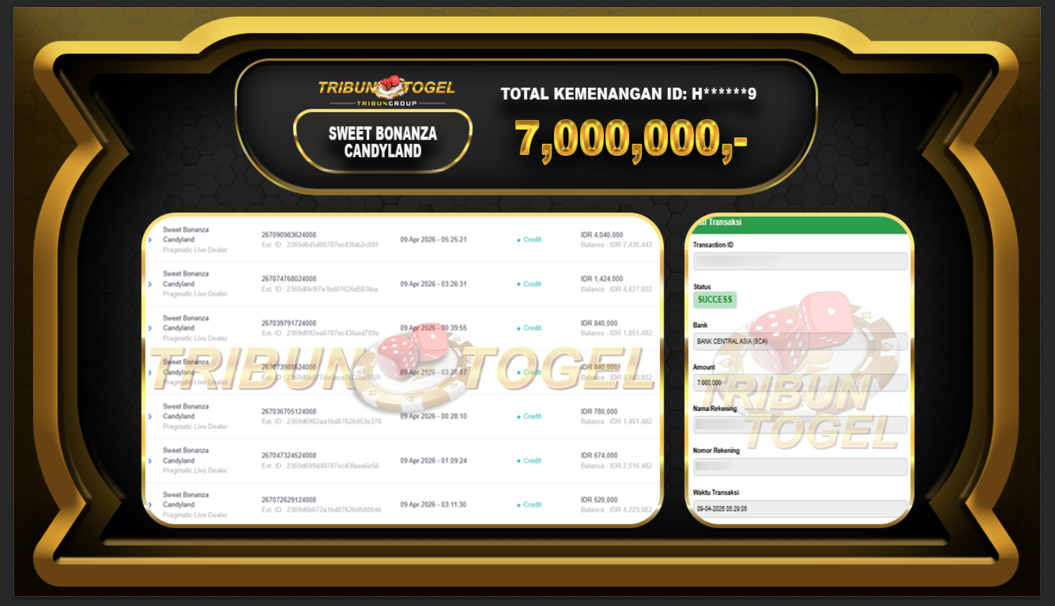Kami ucapkan selamat kepada user ID : H******9 telah berhasil withdraw sebesar Rp.7,000,000,-: SLOT SWEET BONANZA CANDYLAND Bukti pembayaran jackpot member Tribuntogel kami bayar lunas dengan waktu paling singkat.