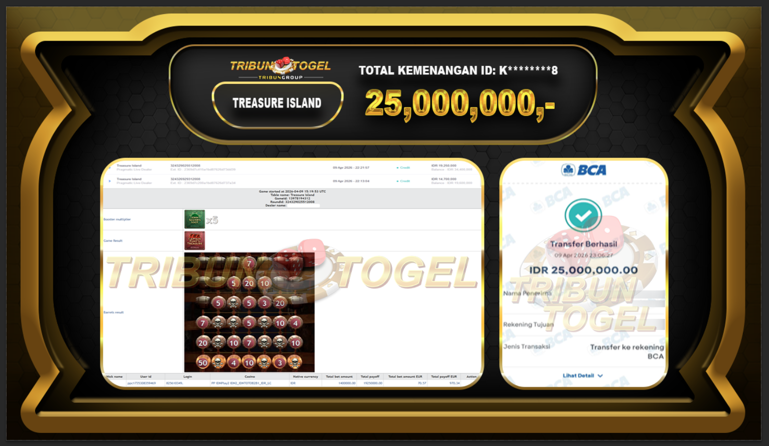Kami ucapkan selamat kepada user ID : K********8 telah berhasil withdraw sebesar Rp.25,000,000,- di game : TREASURE ISLAND Bukti pembayaran jackpot member Tribuntogel kami bayar lunas dengan waktu paling singkat.