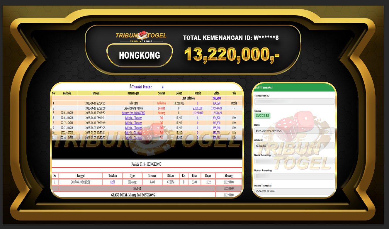 Kami ucapkan selamat kepada user ID :W******8 telah berhasil withdraw sebesar Rp.13,220,000,- di game : HONGKONG LOTTO Bukti pembayaran jackpot member Tribuntogel kami bayar lunas dengan waktu paling singkat.