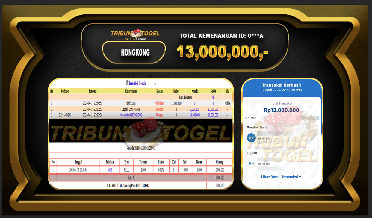 Kami ucapkan selamat kepada user ID :O***A telah berhasil withdraw sebesar Rp.13,000,000,- di game : HONGKONG LOTTO Bukti pembayaran jackpot member Tribuntogel kami bayar lunas dengan waktu paling singkat.