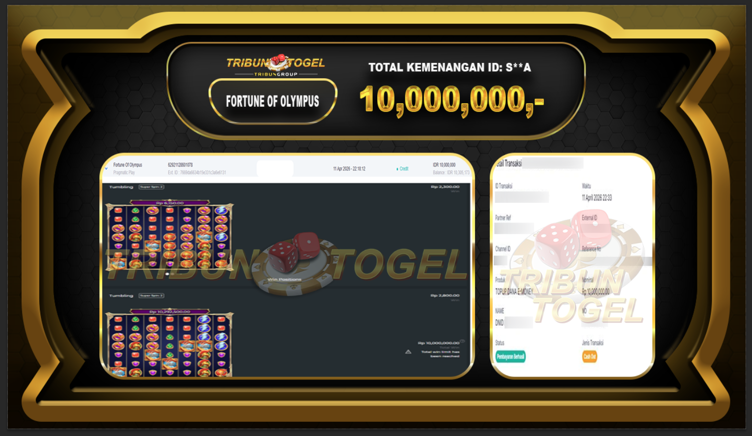 Kami ucapkan selamat kepada user ID : S**A telah berhasil withdraw sebesar Rp. 10.000.000,- di game : FORTUNE OF OLYMPUS Bukti pembayaran jackpot member Tribuntogel kami bayar lunas dengan waktu paling singkat.