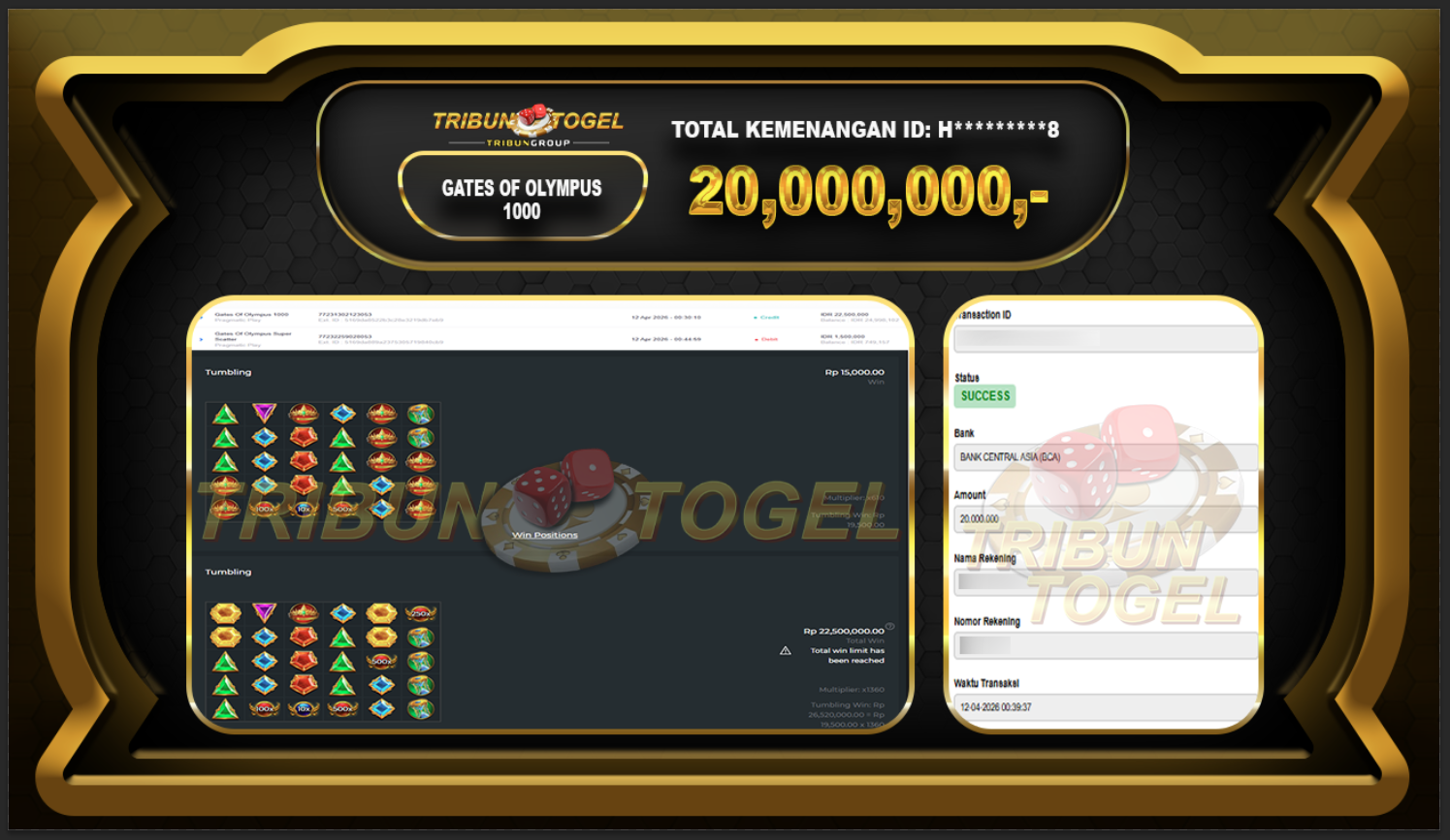 Kami ucapkan selamat kepada user ID : H*********8 telah berhasil withdraw sebesar Rp.20,000,000,- di game : GATES OF OLYMPUS 1000 Bukti pembayaran jackpot member Tribuntogel kami bayar lunas dengan waktu paling singkat.