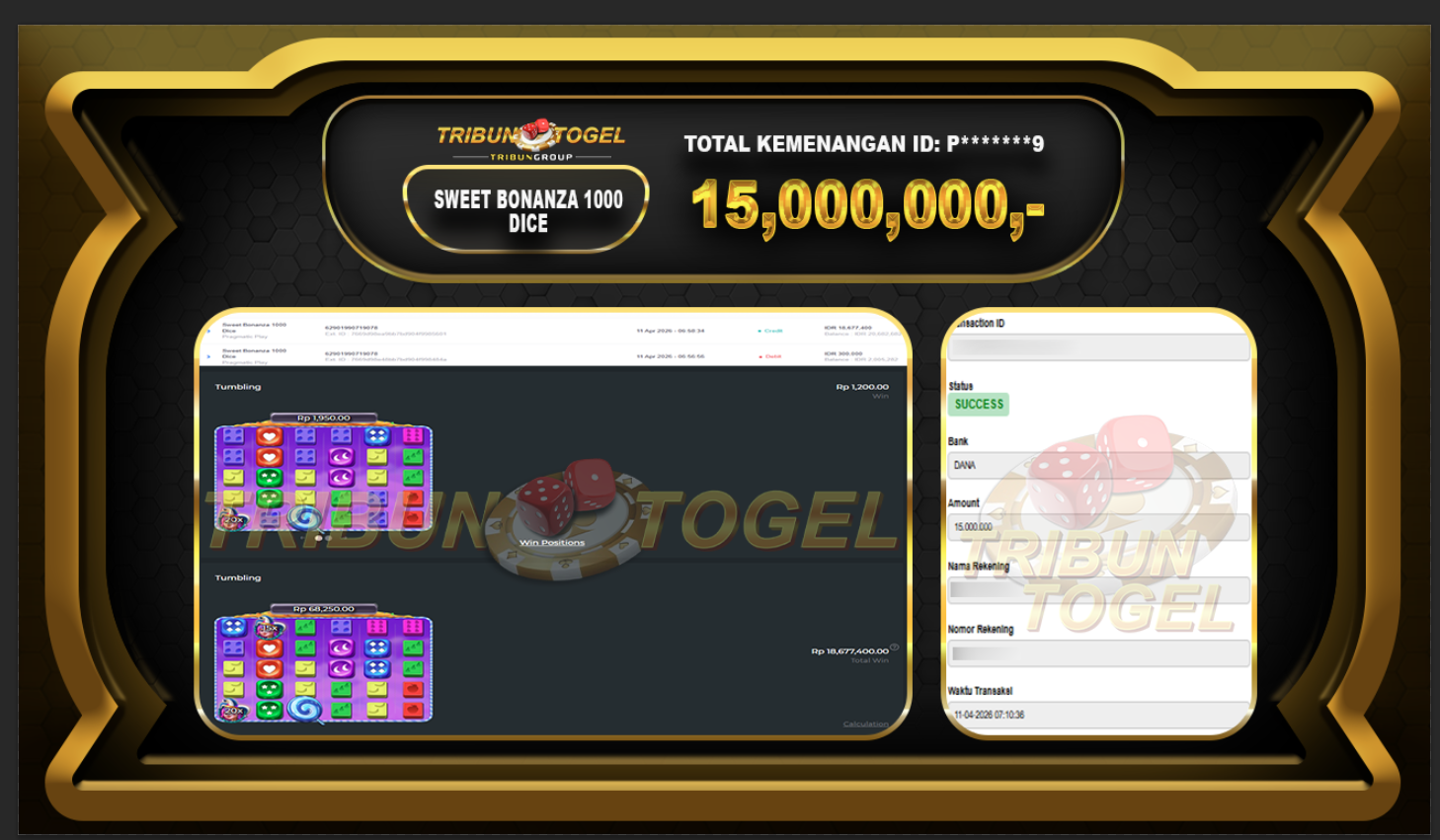 Kami ucapkan selamat kepada user ID : P*********9 telah berhasil withdraw sebesar Rp.15.000.000,- di game : SLOT SWEET BONANZA 1000 DICE Bukti pembayaran jackpot member Tribuntogel kami bayar lunas dengan waktu paling singkat.