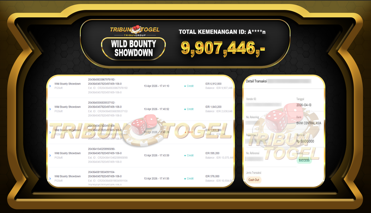 Kami ucapkan selamat kepada user ID : A*****N telah berhasil withdraw sebesar RP.9,907,446- di game : SLOT WILD BOUNTY SHOWDOWN Bukti pembayaran jackpot member Tribuntogel kami bayar lunas dengan waktu paling singkat.