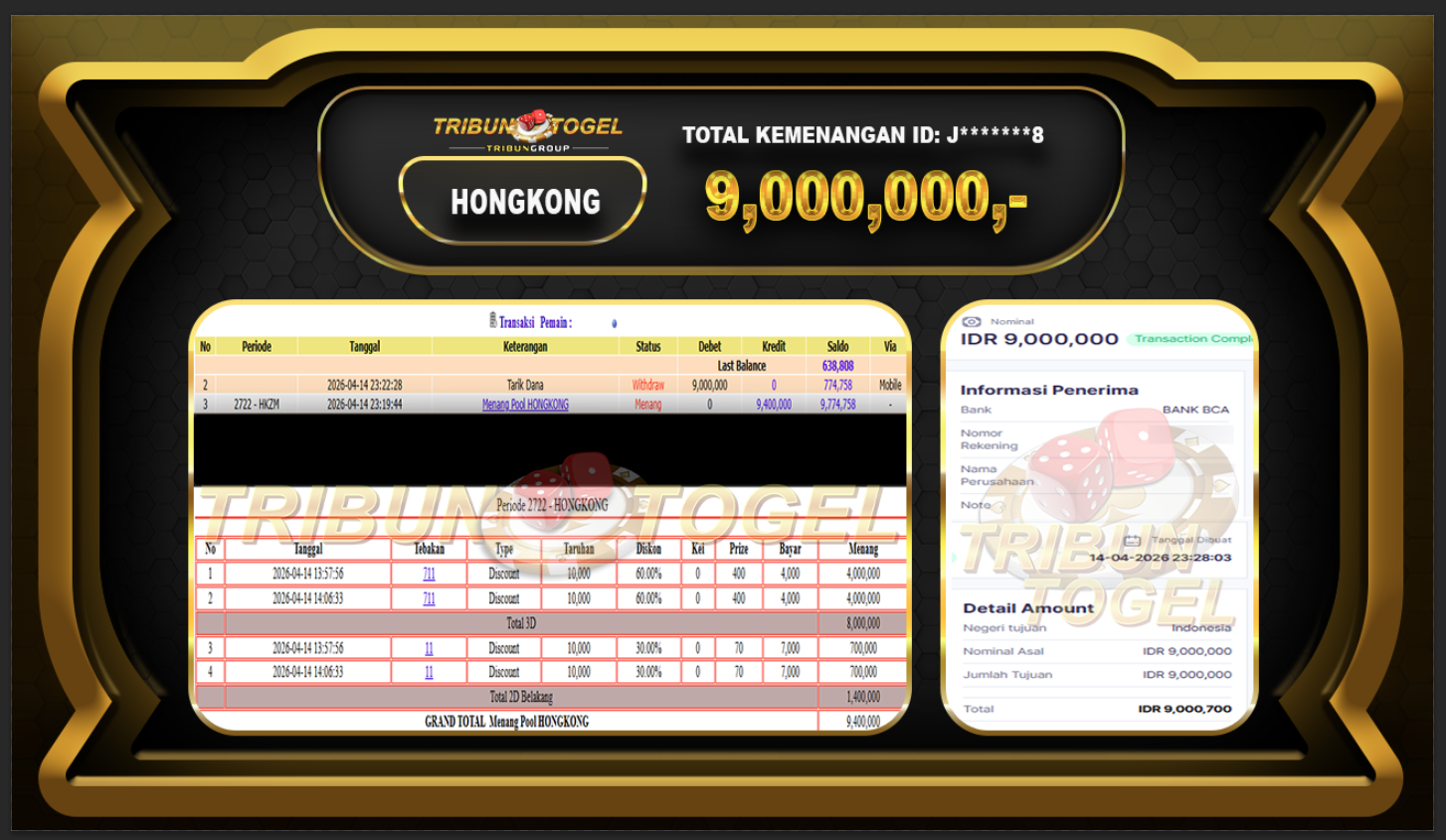 Kami ucapkan selamat kepada user ID :J*******8 telah berhasil withdraw sebesar Rp.9,000,000,- di game : HONGKONG LOTTO Bukti pembayaran jackpot member Tribuntogel kami bayar lunas dengan waktu paling singkat.