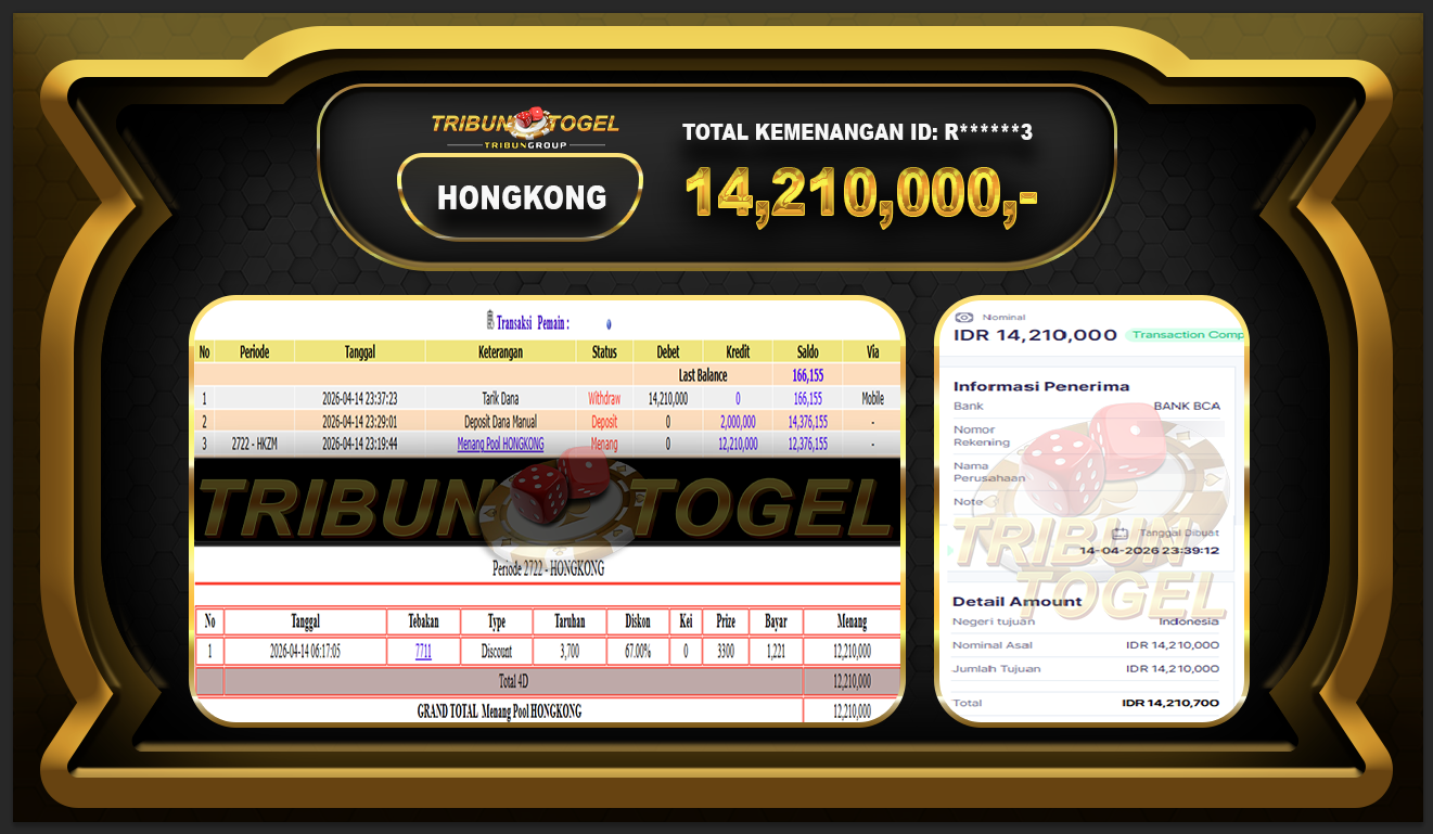 Kami ucapkan selamat kepada user ID :R******3 telah berhasil withdraw sebesar Rp.14,210,000,- di game : HONGKONG LOTTO Bukti pembayaran jackpot member Tribuntogel kami bayar lunas dengan waktu paling singkat.