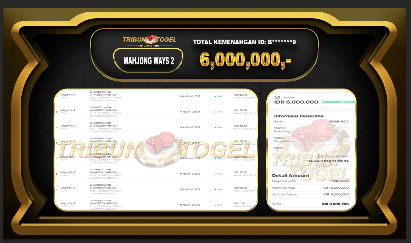 Kami ucapkan selamat kepada user ID : B*******9 telah berhasil withdraw sebesar Rp.6,000,000,- di game : SLOT MAHJONG WAYS 2 Bukti pembayaran jackpot member Tribuntogel kami bayar lunas dengan waktu paling singkat.