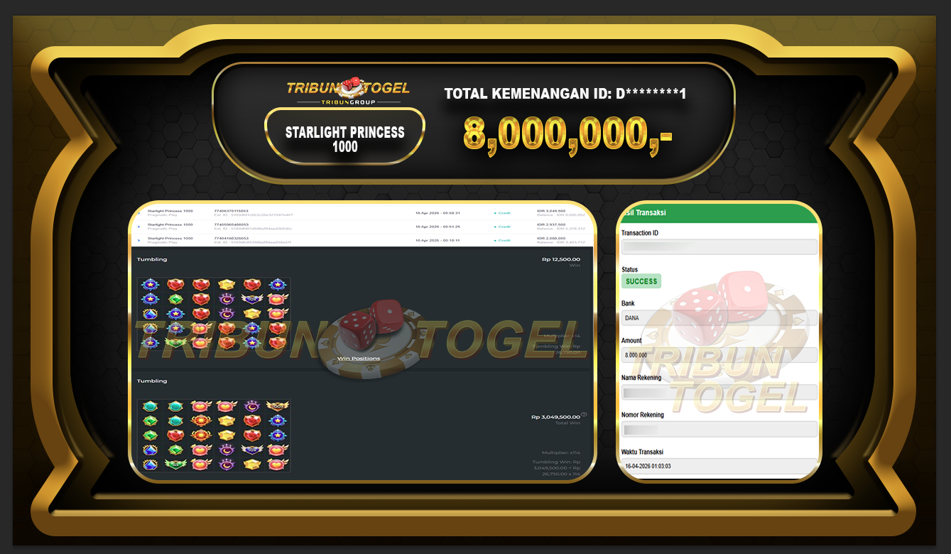 Kami ucapkan selamat kepada user ID : D********1 telah berhasil withdraw sebesar Rp. 8.000.000,- di game : STARLIGHT PRINCESS 1000 Bukti pembayaran jackpot member Tribuntogel kami bayar lunas dengan waktu paling singkat.