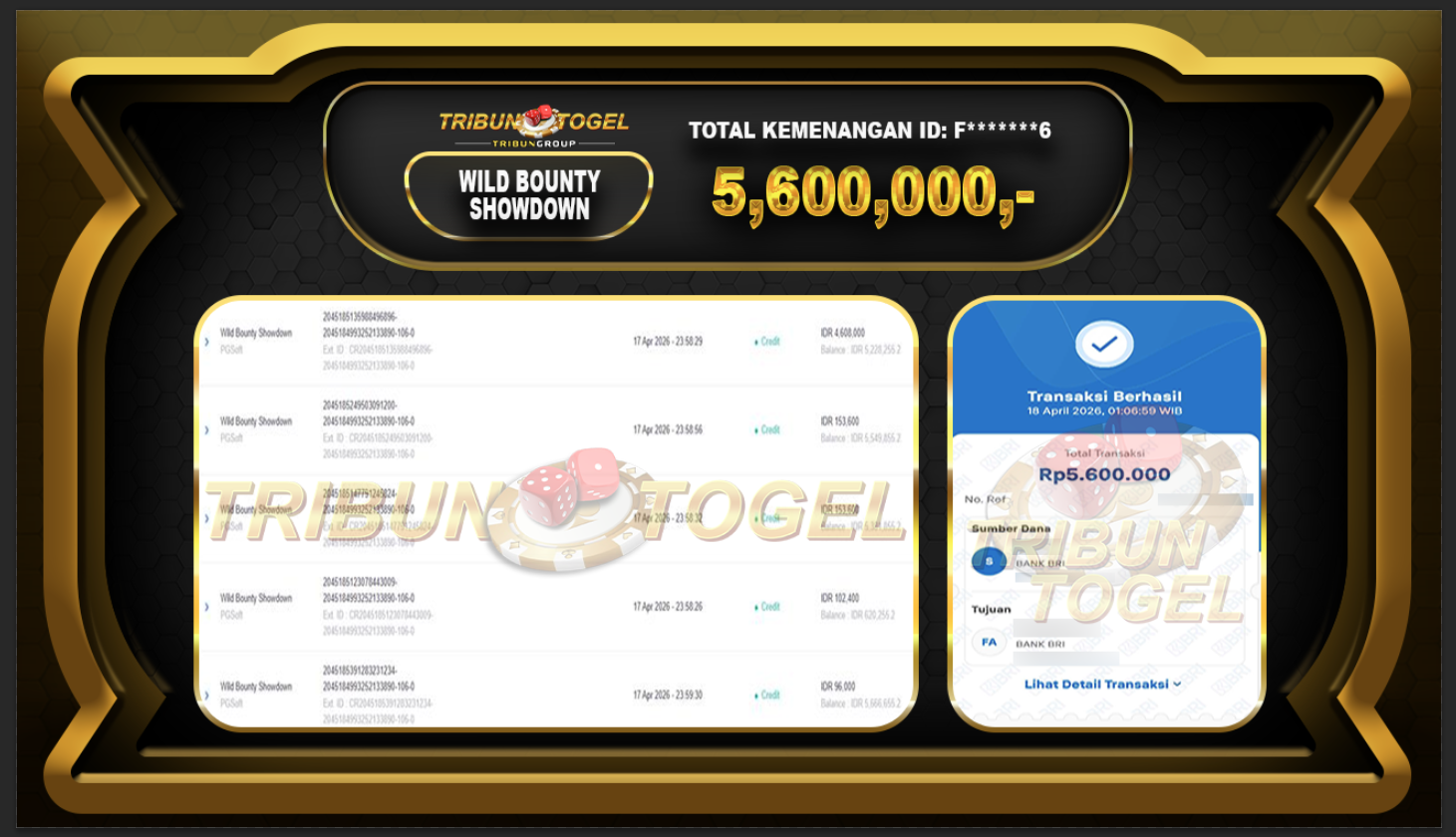 Kami ucapkan selamat kepada user ID : F*******6 telah berhasil withdraw sebesar RP.5,600,000,- di game : SLOT WILD BOUNTY SHOWDOWN Bukti pembayaran jackpot member Tribuntogel kami bayar lunas dengan waktu paling singkat.