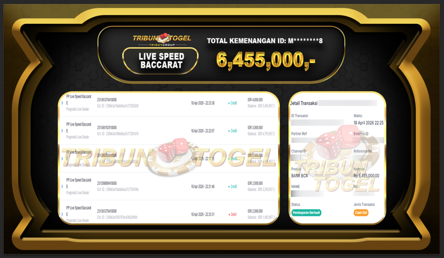 Kami ucapkan selamat kepada user ID : M********8 telah berhasil withdraw sebesar Rp. 6,455,000,- di game : PP LIVE SPEED BACCARAT  Bukti pembayaran jackpot member Tribuntogel kami bayar lunas dengan waktu paling singkat.