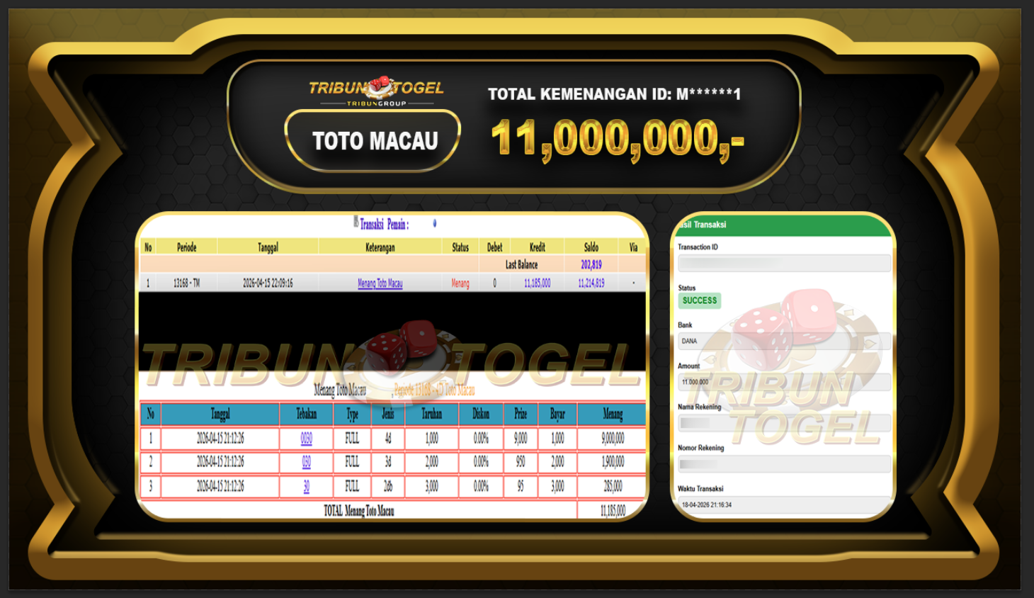 BUKTI PEMBAYARAN TOTO MACAU TRIBUNTOGEL RP.11,000,000,-