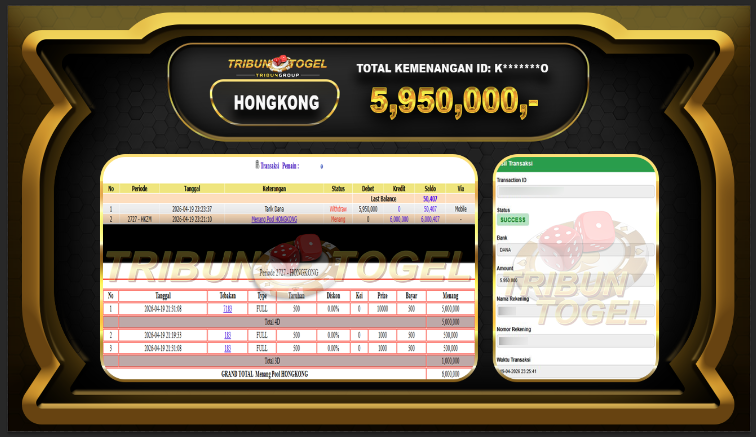 Kami ucapkan selamat kepada user ID :K*******O telah berhasil withdraw sebesar Rp.5,950,000,- di game : HONGKONG LOTTO Bukti pembayaran jackpot member Tribuntogel kami bayar lunas dengan waktu paling singkat.