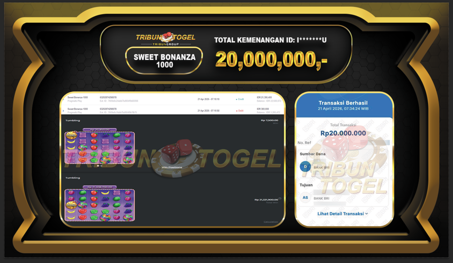 Kami ucapkan selamat kepada user ID : I*******U telah berhasil withdraw sebesar Rp.20,000,000,- game : SLOT SWEET BONANZA 1000 Bukti pembayaran jackpot member Tribuntogel kami bayar lunas dengan waktu paling singkat.