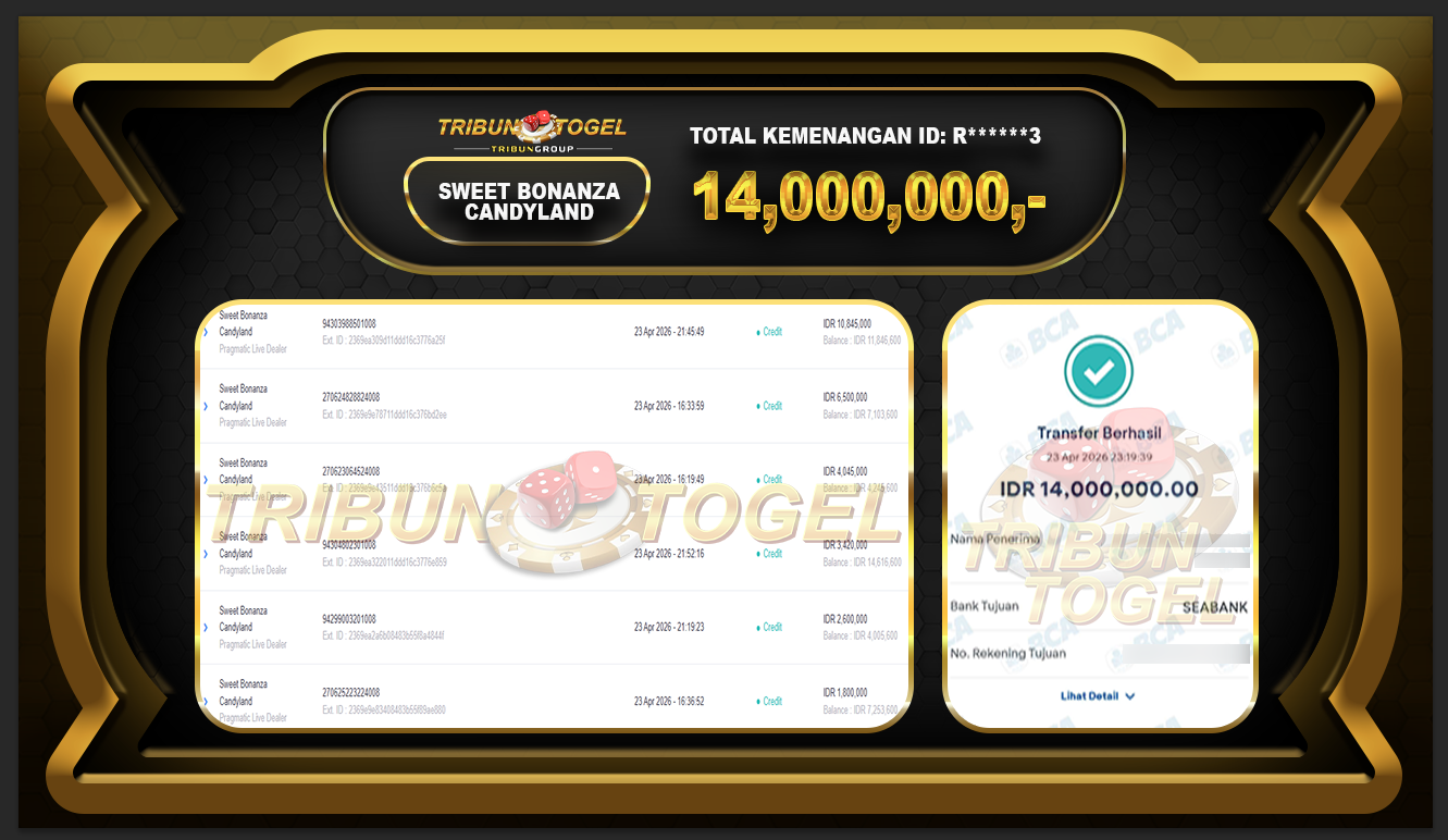 Kami ucapkan selamat kepada user ID : R******3  telah berhasil withdraw sebesar Rp.14,000,000,- : SLOT SWEET BONANZA CANDYLAND  Bukti pembayaran jackpot member Tribuntogel kami bayar lunas dengan waktu paling singkat.