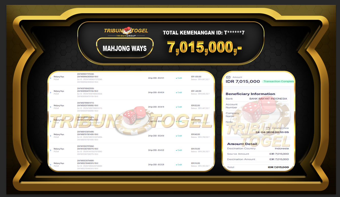Kami ucapkan selamat kepada user ID : T******7  telah berhasil withdraw sebesar Rp.7,015,000,- di game : SLOT MAHJONG WAYS  Bukti pembayaran jackpot member Tribuntogel kami bayar lunas dengan waktu paling singkat.
