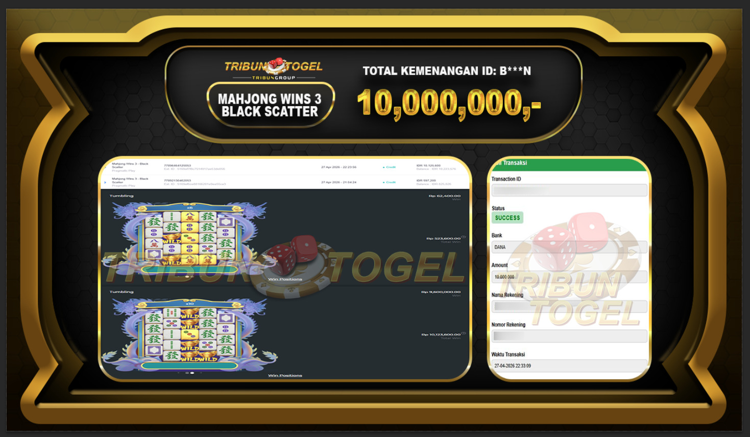 Kami ucapkan selamat kepada user ID : B***N telah berhasil withdraw sebesar Rp.10,000,000,- di game : SLOT MAHJONG WINS 3 BLACK SCATTER Bukti pembayaran jackpot member Tribuntogel kami bayar lunas dengan waktu paling singkat.