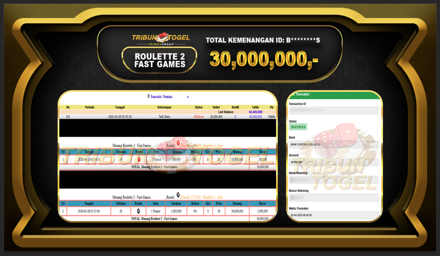 BUKTI PEMBAYARAN ROULETTE TRIBUNTOGEL RP. 30,000,000,-